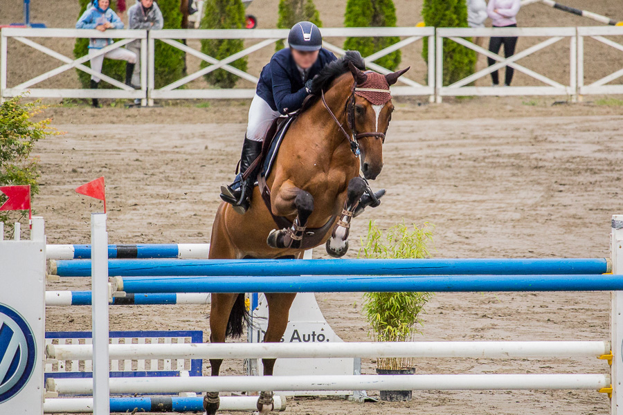 Kun Birdie lopulta vaikutti rentoutuneen, lähdimme ylittämään rataa ensin matalammilla esteillä. Harjoittelimme lähestymisiä hieman eri kulmista yksittäisten esteiden kanssa ja teimme myös rataa pienemmissä osissa. Nostimme esteiden korkeutta aina, kun hypyt tuntuivat sujuvan turhan helposti, ja lopulta pääsimme ylittämään myös 150-senttimetriä korkeita esteitä.