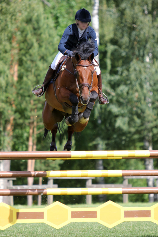 Kun Concorde lopulta vaikutti rentoutuneen, lähdimme ylittämään rataa ensin matalammilla esteillä. Harjoittelimme lähestymisiä hieman eri kulmista yksittäisten esteiden kanssa ja teimme myös rataa pienemmissä osissa. Nostimme esteiden korkeutta aina, kun hypyt tuntuivat sujuvan turhan helposti, ja lopulta pääsimme ylittämään myös 150-senttimetriä korkeita esteitä.
