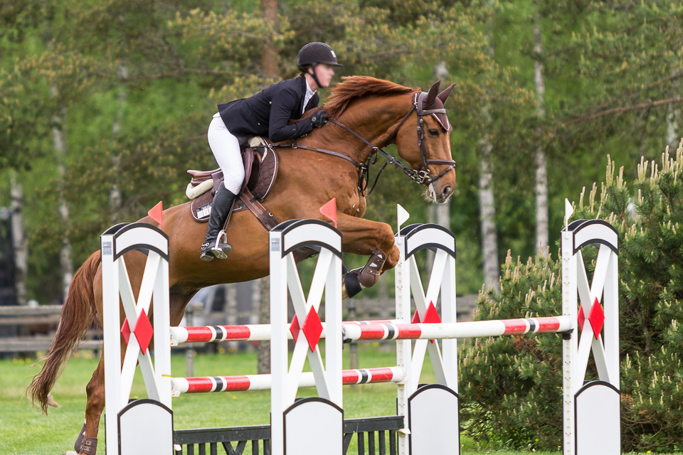 Teimme alkuun kahden ja kolmen esteen sarjoja suorilla lähestymisillä. Tasaiset välimatkat esteiden välillä eivät tuottaneet ongelmia, mutta kun ensimmäisen sekä toisen esteen väliä pidennettiin ja toisen sekä kolmannen esteen väliä puolestaan lyhennettiin, alkoi myös pudotuksia tulla. Oli kova työ saada pidettyä sekä hevonen että omat ajatukset kasassa ja lähteä rohkeasti uudelleen hyppyihin.